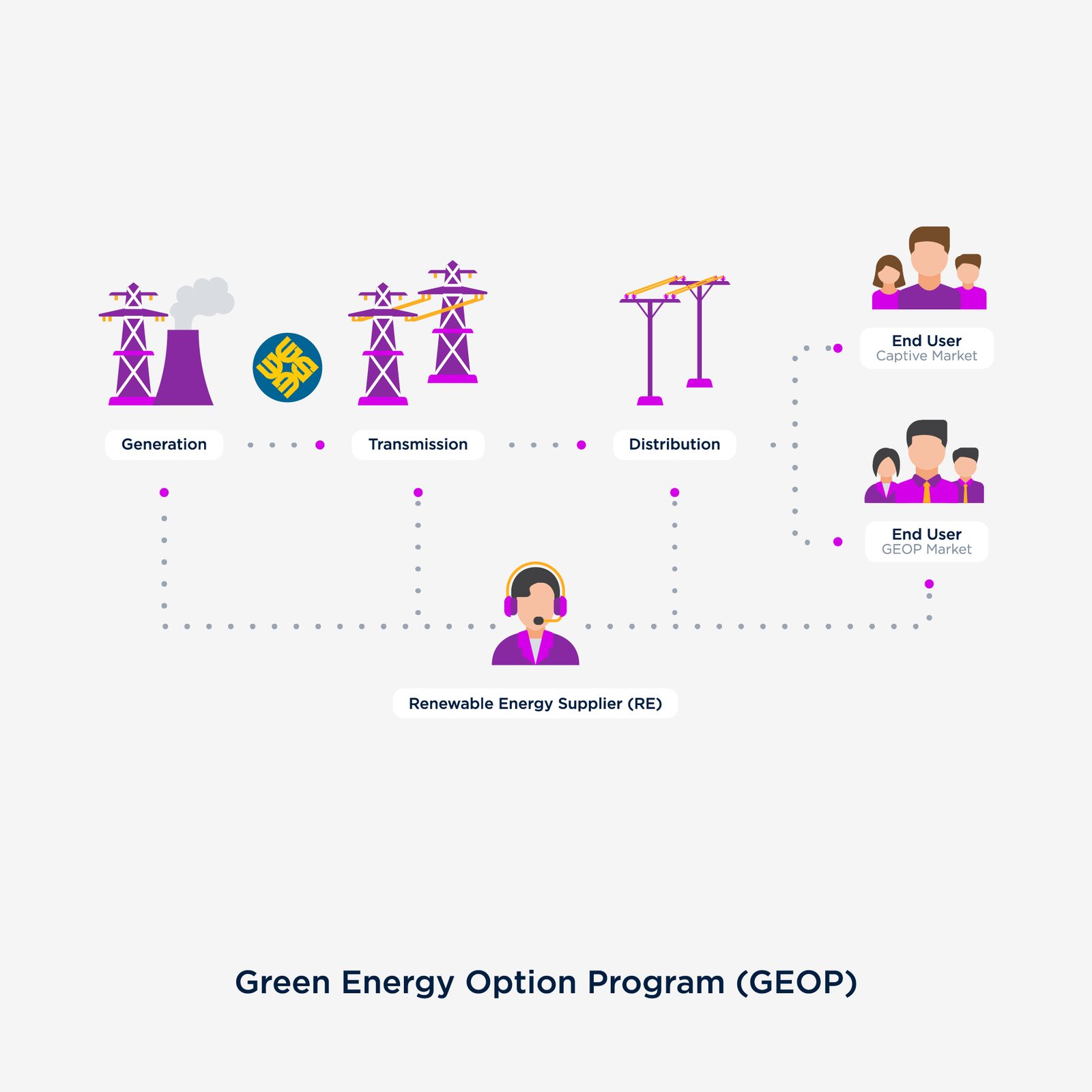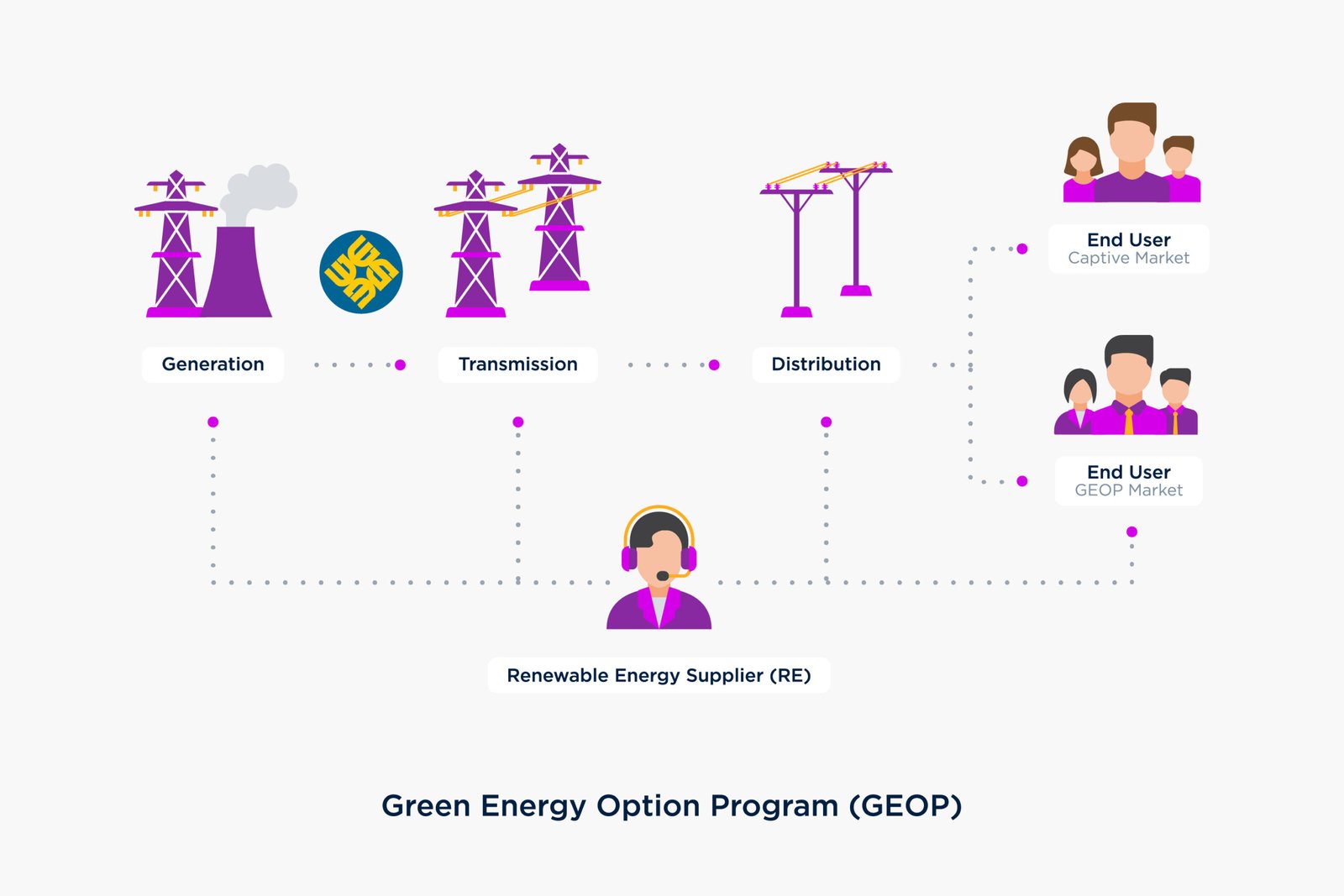 Renewable Energy Supplier transacts with the Generation Companies and Distribution Utilities on behalf of the GEOP Customer to source them energy supply. Electric Generation is supplied via Transmission Lines. National Grid Corporation of the Philippines transmits power to the distribution utility (DU). DU then distributes power accordingly to the captive market end users and GEOP market end users.